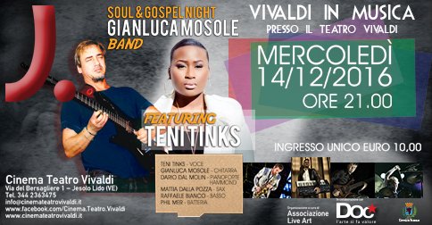 Torna, dal 14 dicembre 2016 all’17 febbraio 2017, Vivaldi in musica, la stagione musicale del Cinema Teatro Vivaldi di Jesolo, giunta alla terza edizione, organizzata da Doc Servizi, Comune di Jesolo e Biblioteca Civica di Jesolo. Si apre con la Soul&Gospel Night, mercoledì 14 dicembre 2016 alle ore 21. Protagonisti della serata, Teni Tinks feat. Gianluca Mosole … Continue reading VIVALDI IN MUSICA